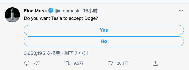 马斯克在Twitter上通过投票的形式提出了这个问题,在发布12个小时之后,这个投票收到了超过330万条回复,近80%的人支持特斯拉接受狗狗币作为支付方式。