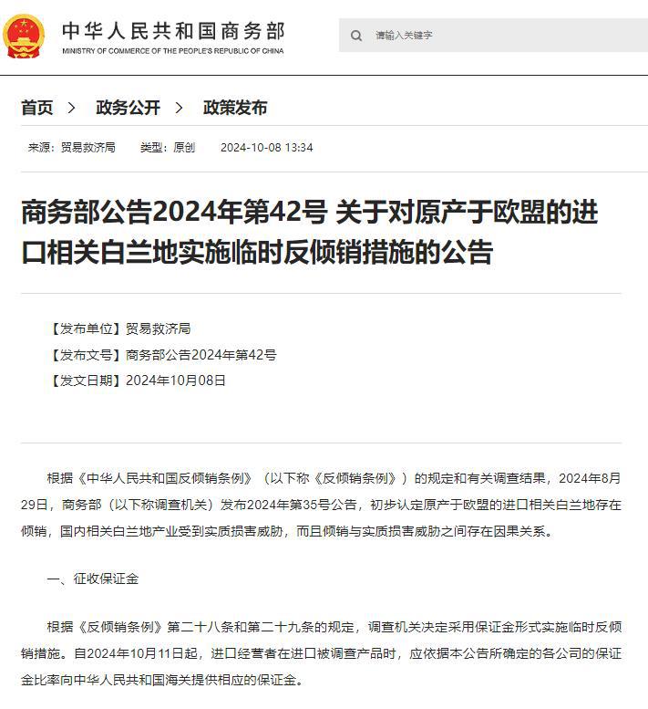 除此之外,商务部在另一份声明中表示,10月8日,中方依法决定对原产于欧盟的进口相关白兰地实施临时反倾销措施。自10月11日起,进口经营者在进口原产于欧盟的相关白兰地时,应向海关提供相应的保证金。