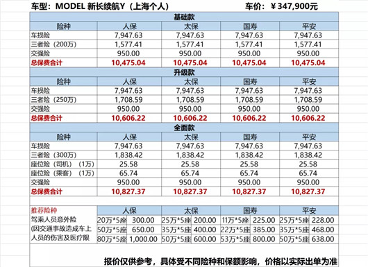 具体了解后得知,以车价347900元的Model Y长续航版车型为例,目前特斯拉提供给车主选择的人保、太保、国寿、平安四家保险公司全面款保费,已经更新为10827.37元。