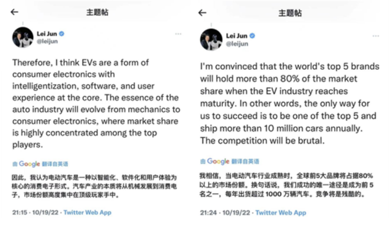 说来也巧,就在马斯克“放炮”不久,雷军也在社交平台上发布了自己对于电动车的看法。