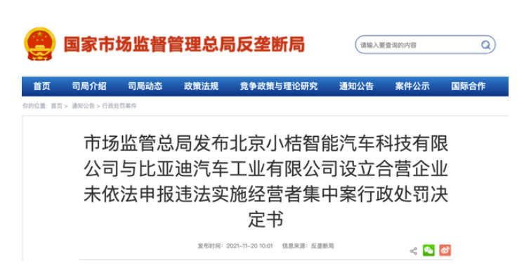 北京小桔智能汽车科技有限公司与比亚迪汽车工业有限公司设立合营企业案违反反垄断法,分别被罚50万元。文件显示,2019年7月10日,小桔智能与比亚迪签署《合资经营合同》设立合营企业,滴滴持股35%,比亚迪持股65%。2019年11月1日,合营企业取得营业执照。