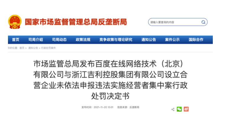 百度在线网络技术(北京)有限公司与浙江吉利控股集团有限公司设立合营企业违反反垄断法,分别被罚50万元。文件显示,2021年1月10日,百度在线与吉利签署《百度在线网络技术(北京)有限公司及浙江吉利控股集团有限公司关于设立新能源汽车领域合资公司之合资经营合同》,设立合营企业,百度在线与吉利分别持股55%和45%。根据上述协议,合营企业由双方共同控制。2021年3月2日,合营企业取得营业执照。