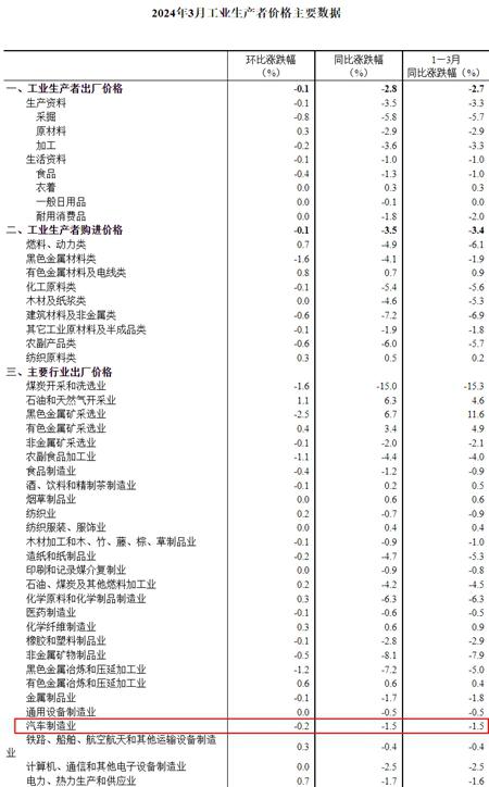 此外,国家统计局还发布了全国工业生产者出厂价格,其3月份同比下降2.8%,环比下降0.1%;一季度,工业生产者出厂价格比上年同期下降2.7%。其中,汽车制造业出厂价格环比微降0.2%,同比下降1.5%;综合1-3月,累计下降1.5%。