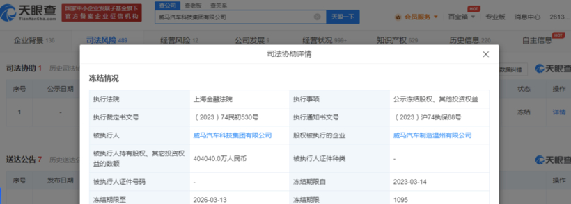 天眼查显示,威马汽车科技集团有限公司新增一则股权冻结信息,威马汽车制造温州有限公司高达40.4亿元的股权被冻结,冻结期限自2023年3月14日至2026年3月13日。
