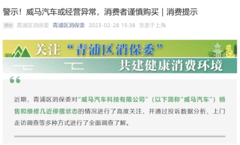 2月28日,上海市青浦区消保委在微信公众号发布了一则名为《警示!威马汽车或经营异常,消费者谨慎购买》的消费提示。
