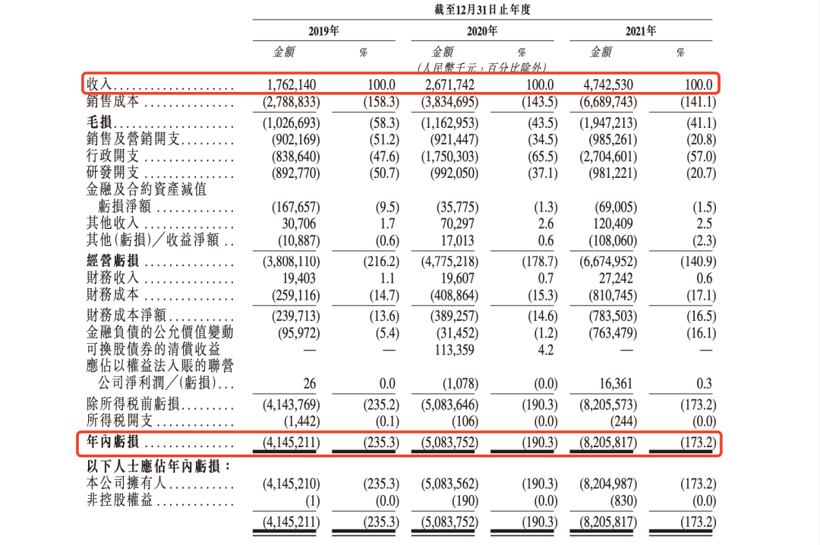 据其此前发布的招股书显示,2019年~2021年,威马持续亏损。三年间,其营收分别为17.62亿元、26.72亿元和47.43亿元;毛利率为-58.3%、-43.5%和-41.1%,亏损分别为-41.45亿元、-50.83亿元、-82.05亿元,累计亏损超170亿元。