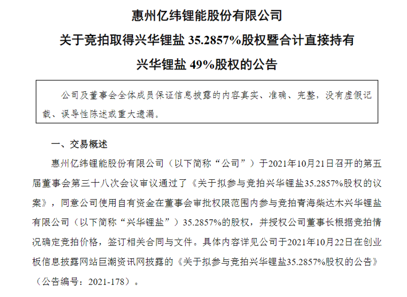 1月12日,亿纬锂能发布公告称,公司于2021年10月21日召开的董事会审议通过了《关于拟参与竞拍兴华锂盐35.2857%股权的议案》,同意公司使用自有资金在董事会审批权限范围内参与竞拍青海柴达木兴华锂盐有限公司(以下简称“兴华锂盐”)35.2857%的股权。