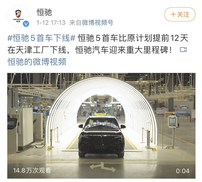 恒驰5下线;图片来源:恒驰官方微博截图