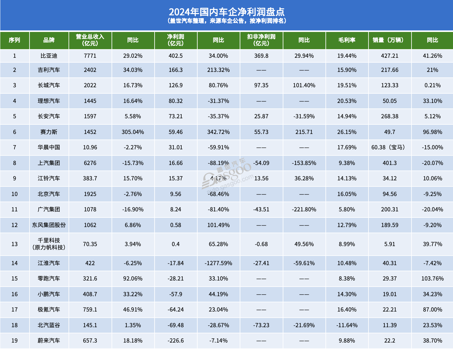 车联智核整理的2024年中国车企净利润情况显示,车企之间的业绩差异非常明显。比亚迪是毫无疑问的领跑者,稳坐国内最赚钱车企“宝座”,2024年净利润402.5亿元,增长34%。吉利汽车的表现也不错,2024年的净利润达到了166.3亿元,同比翻了两番。长城汽车的情况则更有代表性,在年销量基本维持不变的情况下,实现了超80%的利润增长。