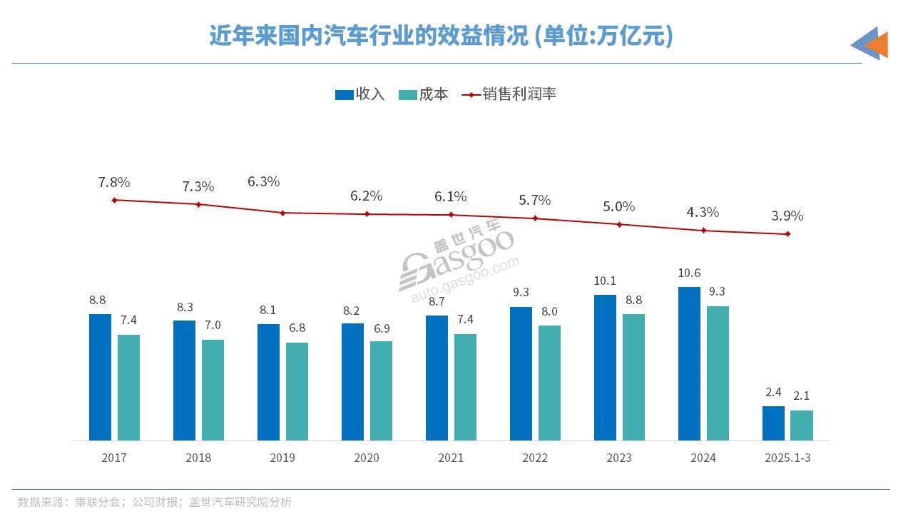 2017年至今,国内汽车行业的销售利润率可以说是直线下滑,已经从2017年的7.8%下滑至2024年的4.3%,2025年的第一季度,车市销售利润率进一步下探到了3.9%。而这一阶段的市场大背景是,虽然中国车市遭遇过疫情影响,也被芯片等核心部件卡过脖子,车市的年度表现有过波动,但从整体上看,销量表现还是以稳步向上为主。