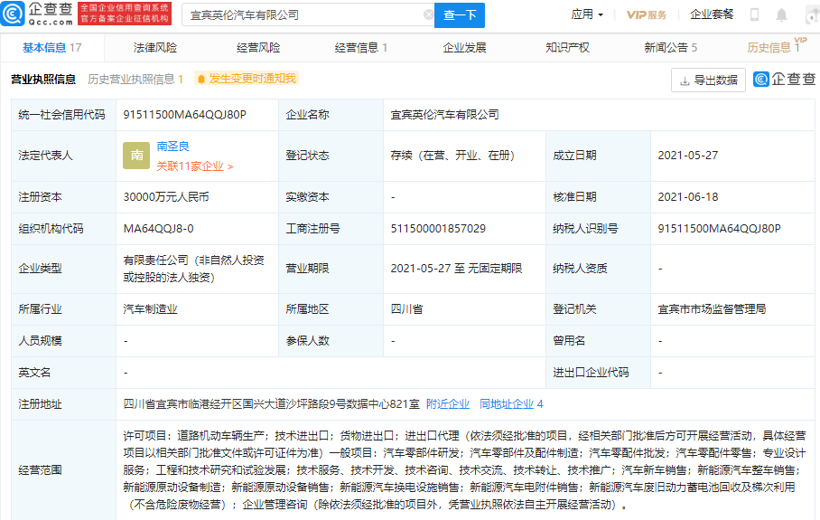 企查查公布的信息显示,5月25日,宜宾英伦新能源汽车科技有限公司成立,法定代表人为南圣良,注册资本4亿元人民币,经营范围包含:汽车零部件研发、汽车零部件及配件制造、汽车零配件批发、汽车零配件零售、专业设计服务等。