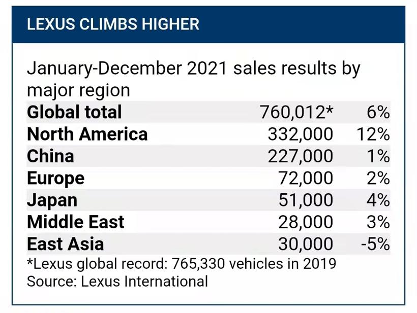 雷克萨斯在过去的2021年全球累计销售76.1万辆,同比增长6%。这样的成绩,与历史最高的2019年(76.5万辆)几乎并列,为该品牌历史第二的年度销量业绩。