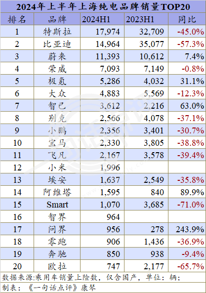 根据上半年上海纯电品牌销量TOP20的情况来看,大多数品牌确实损失惨重,比如特斯拉和比亚迪都从去年同期的3万余辆直降至不足2万辆,但抛开今年才首次进入上海市场的小米、智界和极越,还是有5个品牌销量依旧继续增加。