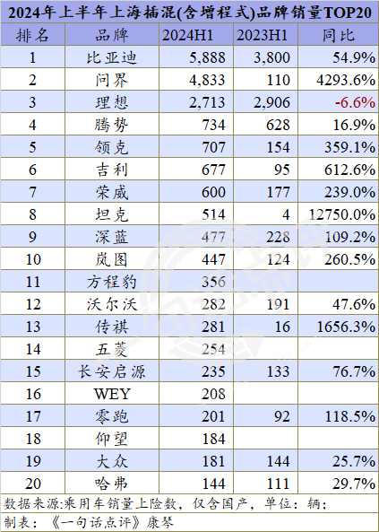 同样选取上半年上海插混品牌销量TOP20数据,会发现正如纯电市场中有不少幸运儿逆势增长一样,即便插混市场大幅增长,也有部分品牌没能完全恢复,比如榜单中的理想。