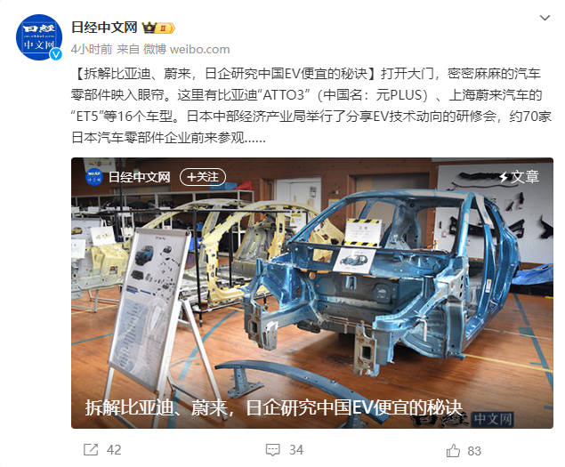 《日本经济新闻》最新报道,日本经济产业局近日举办了一次电动汽车研讨会,约有70家日本汽车零部件企业访问了拆解展示,共同探讨中国产电动汽车的车身结构和零部件等特点。
