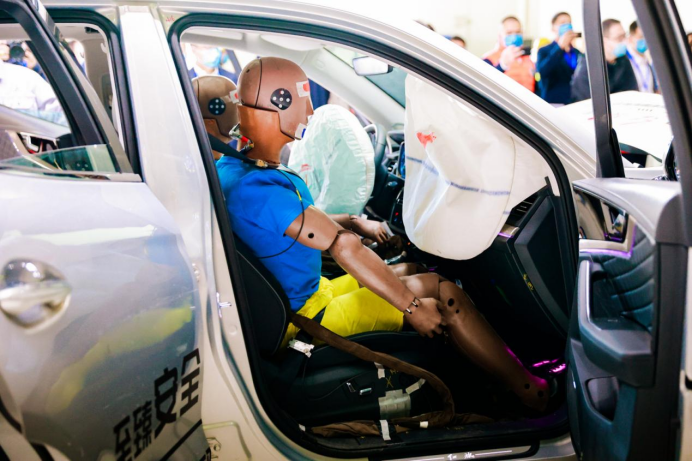 除了全方位的车身防护,高效严密的乘员防护在本次碰撞测试中功不可没。全车八安全气囊在发生碰撞后均迅速点爆,在与车内假人发生接触时均已完全处在完全充气状态,结合车内的双级限力安全带,分阶段智能施加约束力,有效地降低了车内驾乘人员伤害。