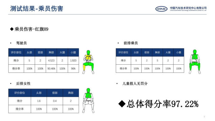 本次测试中,H9在先追尾碰撞大货车之后,又遭到后车“前后夹击”的连环追撞。车内乘员的伤害结果数据方面,在严苛的测试条件下,红旗H9驾驶员5个评价部位中,胸部和小腿得分分别为90.46%和96%,头部、颈部、大腿部均获得100%的满分;前排副驾驶位乘员和后排女性的5个部位全部得到100%的满分,儿童假人零罚分,总体得分率为97.22%,安全表现臻于完美。不难看出,在极限测试下仍能取得高分表现的红旗H9,将在绝大多数道路安全事故下,最大程度守护驾乘人员生命安全。同时,作为双车高速追尾碰撞测试的后车,红旗HS5最终表现优异,展现出令人惊艳的安全性能。