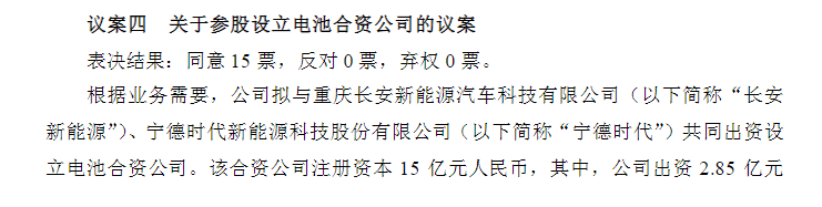 该合资公司注册资本15亿元,其中,公司出资2.85亿元,占比19%;长安新能源出资4.5亿元,占比30%;宁德时代出资7.65亿元,占比51%。本次 交 易 还 需 取 得 国 家反垄断局的批准。